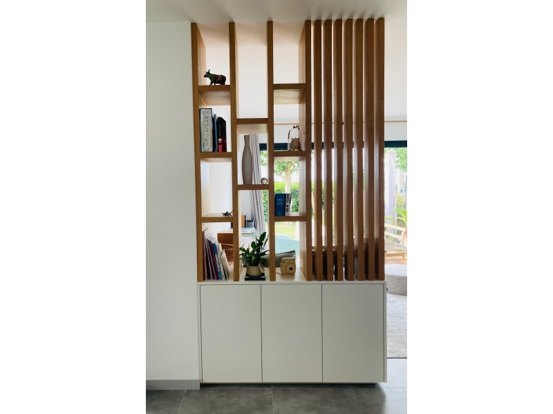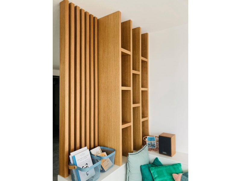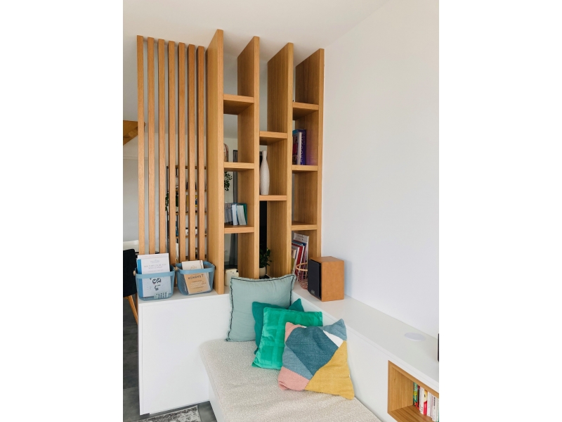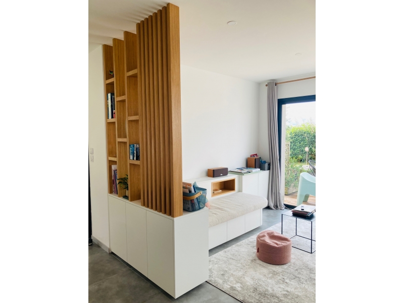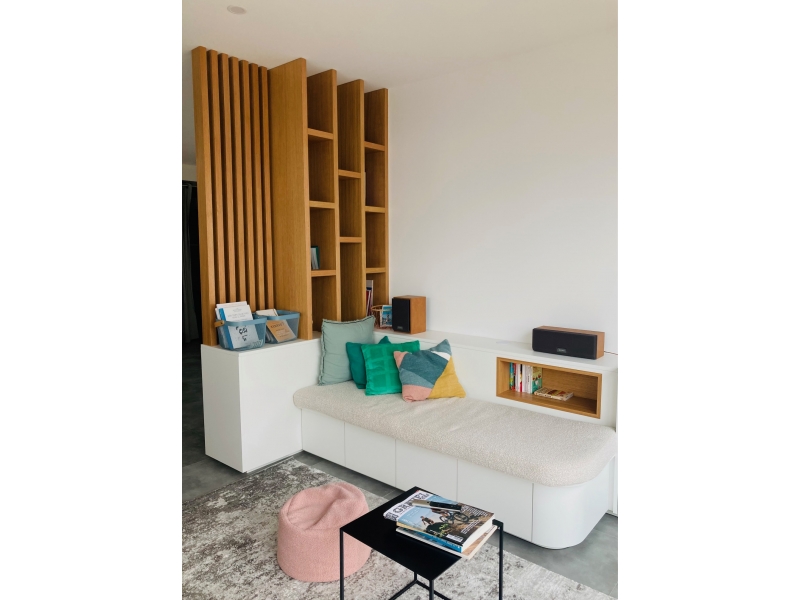 Je leur ai dessiné un meuble sur mesure comprenant, une séparation, du rangement, une banquette le tout en harmonie avec leur intérieur.